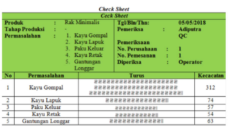 Contoh pemakaian check sheet untuk menulis jenis cacat suatu produk di pabrik furnitur: