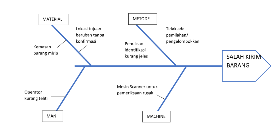 Fishbone diagram digunakan untuk mengidentifikasi penyebab utama suatu masalah, menggunakan faktor “5M” (Man, Machine, Method, Material, Measurement).