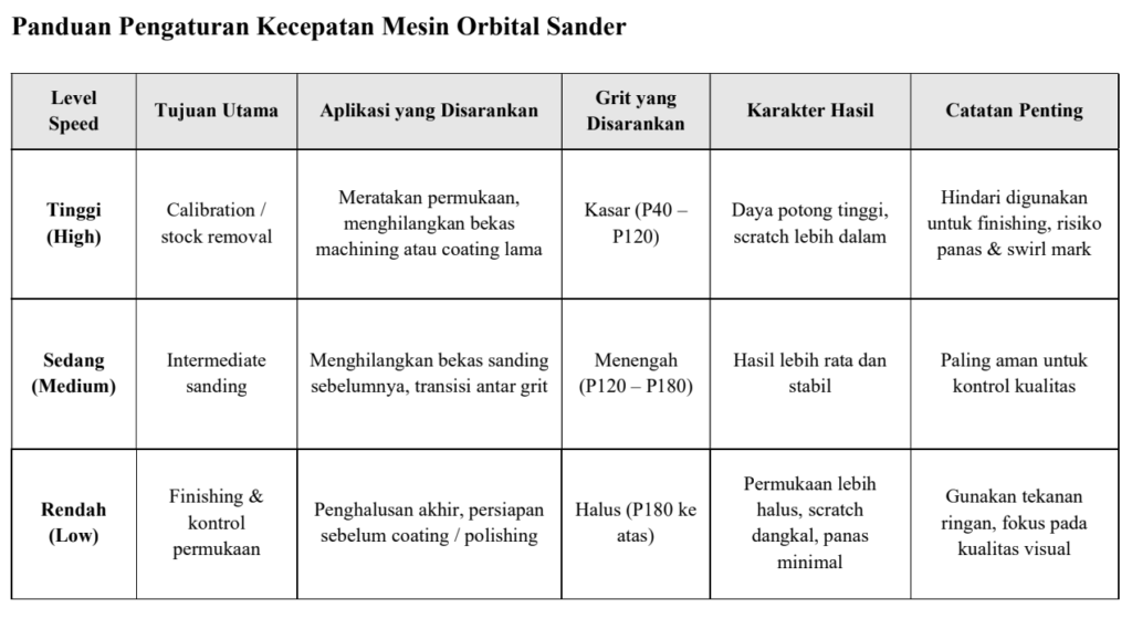 Speed pada orbital sander bukan sekadar pengatur kecepatan kerja, melainkan parameter penting dalam kontrol kualitas hasil sanding. Pengaturan speed yang tepat, dikombinasikan dengan grit dan tekanan yang sesuai, dapat membuat proses kerja lebih efektif dan efisien, meningkatkan hasil akhir atau kualitas, mengurangi rework, dan memperpanjang umur amplas.