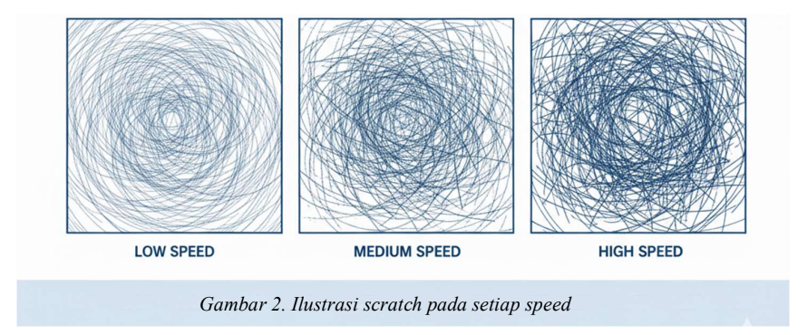 Speed tinggi cenderung menghasilkan scratch yang lebih jelas dan agresif, sedangkan speed rendah menghasilkan pola scratch yang lebih halus dan lebih terkontrol.